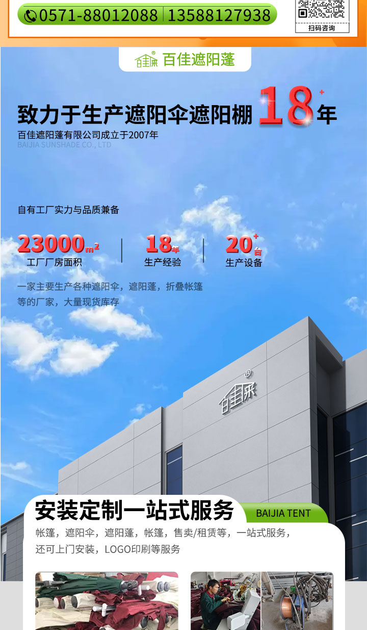 杭州百佳遮阳蓬有限公司公司创建于2007年2月22日,主要生产各类折叠帐篷,太阳伞及编藤户外家具,年生产量16万套帐篷,13万把广告太阳伞,3.5多万张编藤系列桌椅户外家具等。年销售额4000万元,两家公司及驻外分公司总占地面积25亩地,2.3万平方米,在职工人135人,其中技术人员16人及20余人销售团队,业务遍及全国及部分欧美国家,全国营销大师,顾佳公司产品推广董事长兼总经理顾克东先生,始终以客户需求为导向,以股东利益为追求,与员工共同成长为已任,为满足顾客售前售后服务而努力奋斗。
