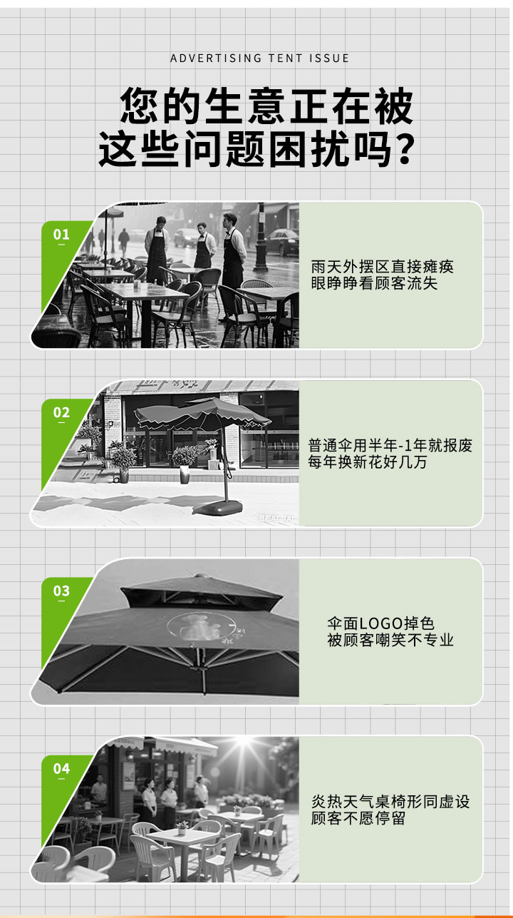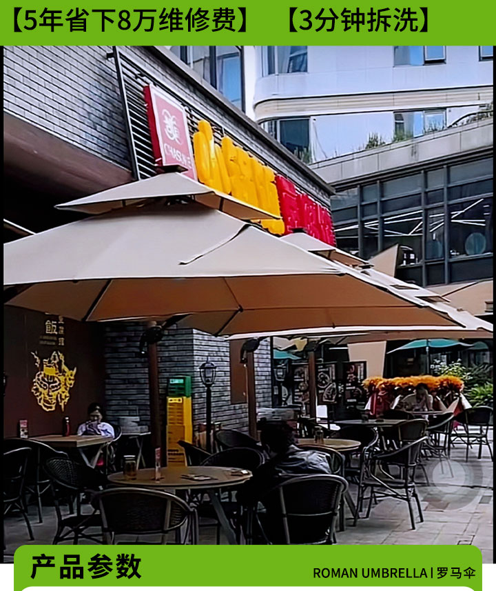 罗马伞用途:休闲场所、咖啡厅、别墅花园、露天、茶座、草坪、户外、酒吧街、商业街、门卫物业、景区