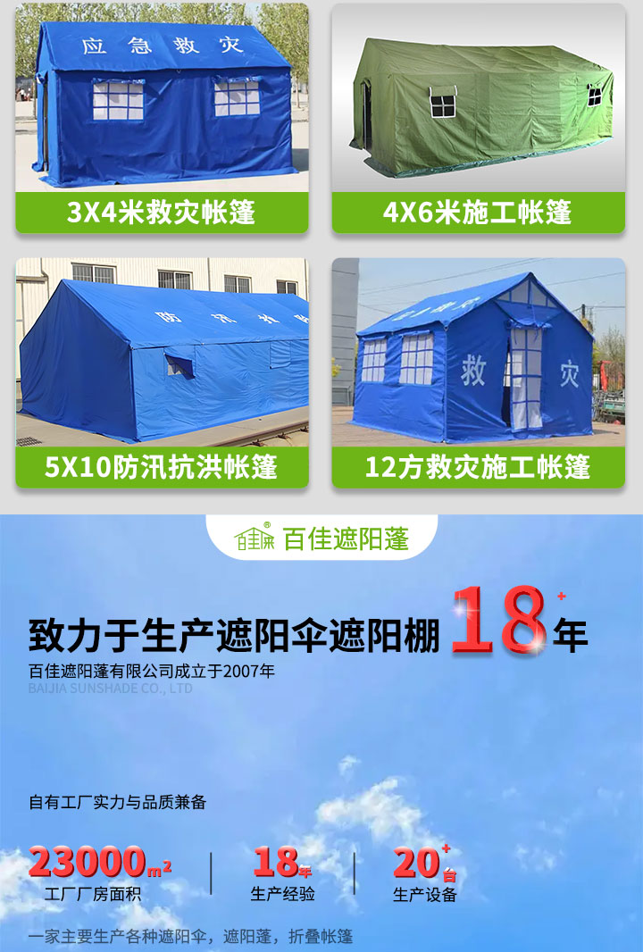 杭州百佳遮阳蓬有限公司公司创建于2007年2月22日,主要生产各类折叠帐篷,太阳伞及编藤户外家具,年生产量16万套帐篷,13万把广告太阳伞,3.5多万张编藤系列桌椅户外家具等。年销售额4000万元,两家公司及驻外分公司总占地面积25亩地,2.3万平方米,在职工人135人,其中技术人员16人及20余人销售团队,业务遍及全国及部分欧美国家,全国营销大师,顾佳公司产品推广董事长兼总经理顾克东先生,始终以客户需求为导向,以股东利益为追求,与员工共同成长为已任,为满足顾客售前售后服务而努力奋斗。
