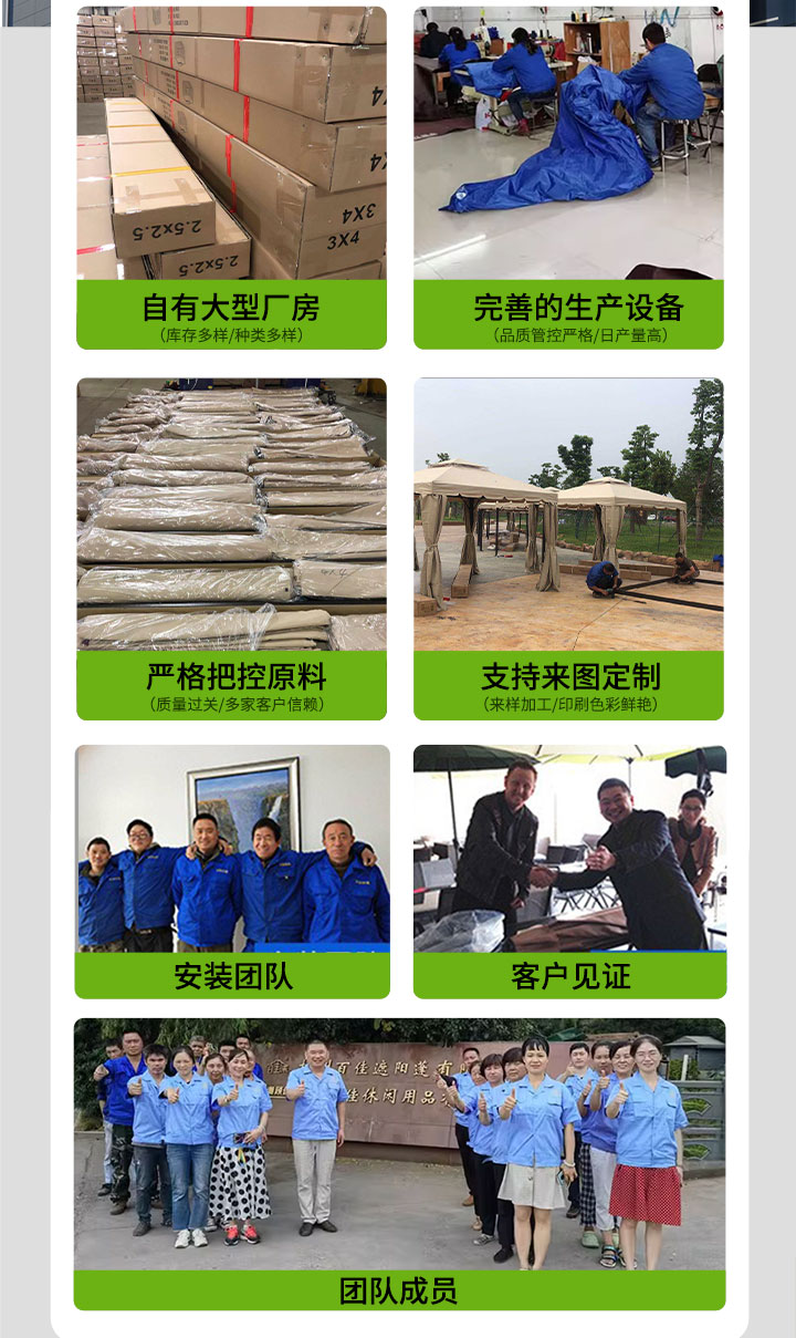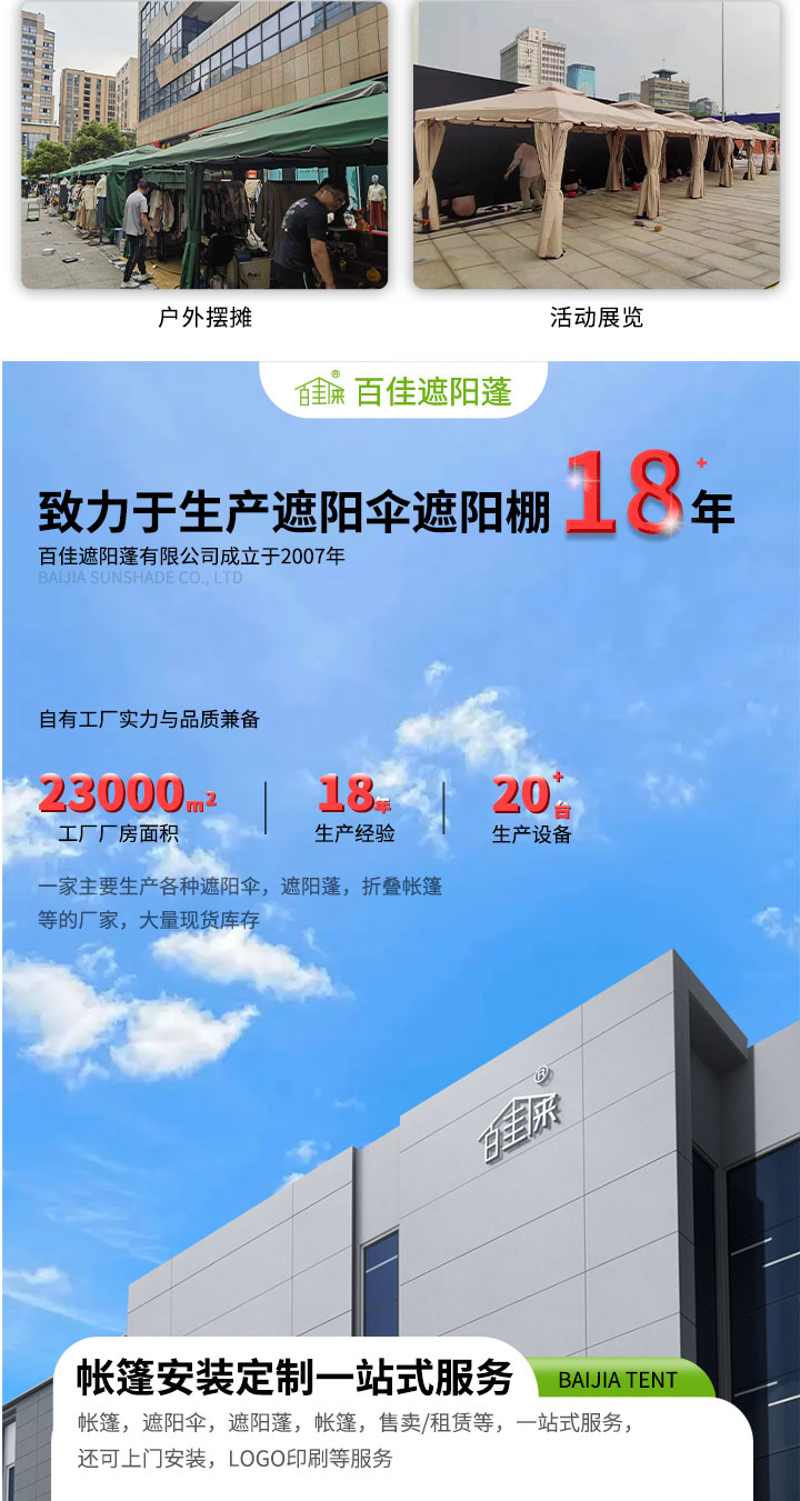杭州百佳遮阳蓬有限公司公司创建于2007年2月22日,主要生产各类折叠帐篷,太阳伞及编藤户外家具,年生产量16万套帐篷,13万把广告太阳伞,3.5多万张编藤系列桌椅户外家具等。年销售额4000万元,两家公司及驻外分公司总占地面积25亩地,2.3万平方米,在职工人135人,其中技术人员16人及20余人销售团队,业务遍及全国及部分欧美国家,全国营销大师,顾佳公司产品推广董事长兼总经理顾克东先生,始终以客户需求为导向,以股东利益为追求,与员工共同成长为已任,为满足顾客售前售后服务而努力奋斗。