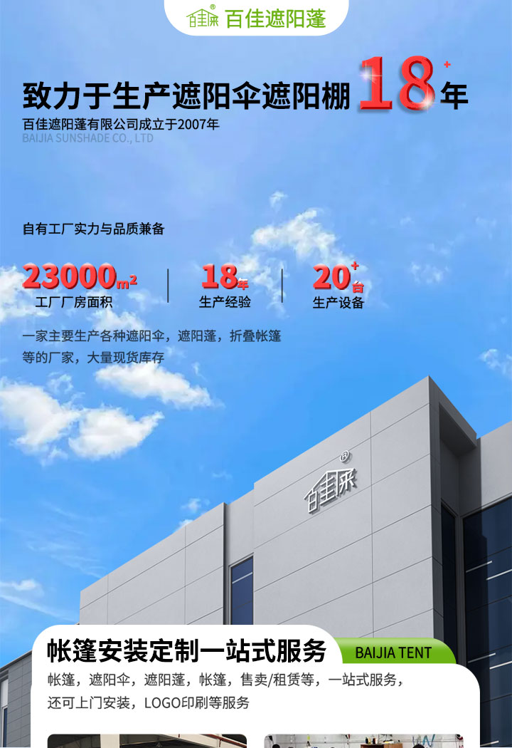 杭州百佳遮阳蓬有限公司公司创建于2007年2月22日,主要生产各类折叠帐篷,太阳伞及编藤户外家具,年生产量16万套帐篷,13万把广告太阳伞,3.5多万张编藤系列桌椅户外家具等。年销售额4000万元,两家公司及驻外分公司总占地面积25亩地,2.3万平方米,在职工人135人,其中技术人员16人及20余人销售团队,业务遍及全国及部分欧美国家,全国营销大师,顾佳公司产品推广董事长兼总经理顾克东先生,始终以客户需求为导向,以股东利益为追求,与员工共同成长为已任,为满足顾客售前售后服务而努力奋斗。